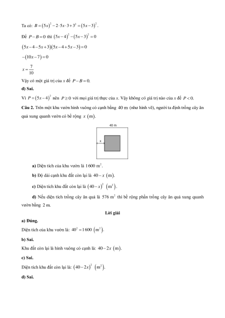 Khu đất còn lại là hình vuông có cạnh là: 40 2x m. c) Sai.