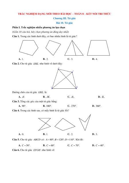 Câu 1. Trong các hình dưới đây, có bao nhiêu hình là tứ giác? A. 1. B. 2. C. 3. D. 4.