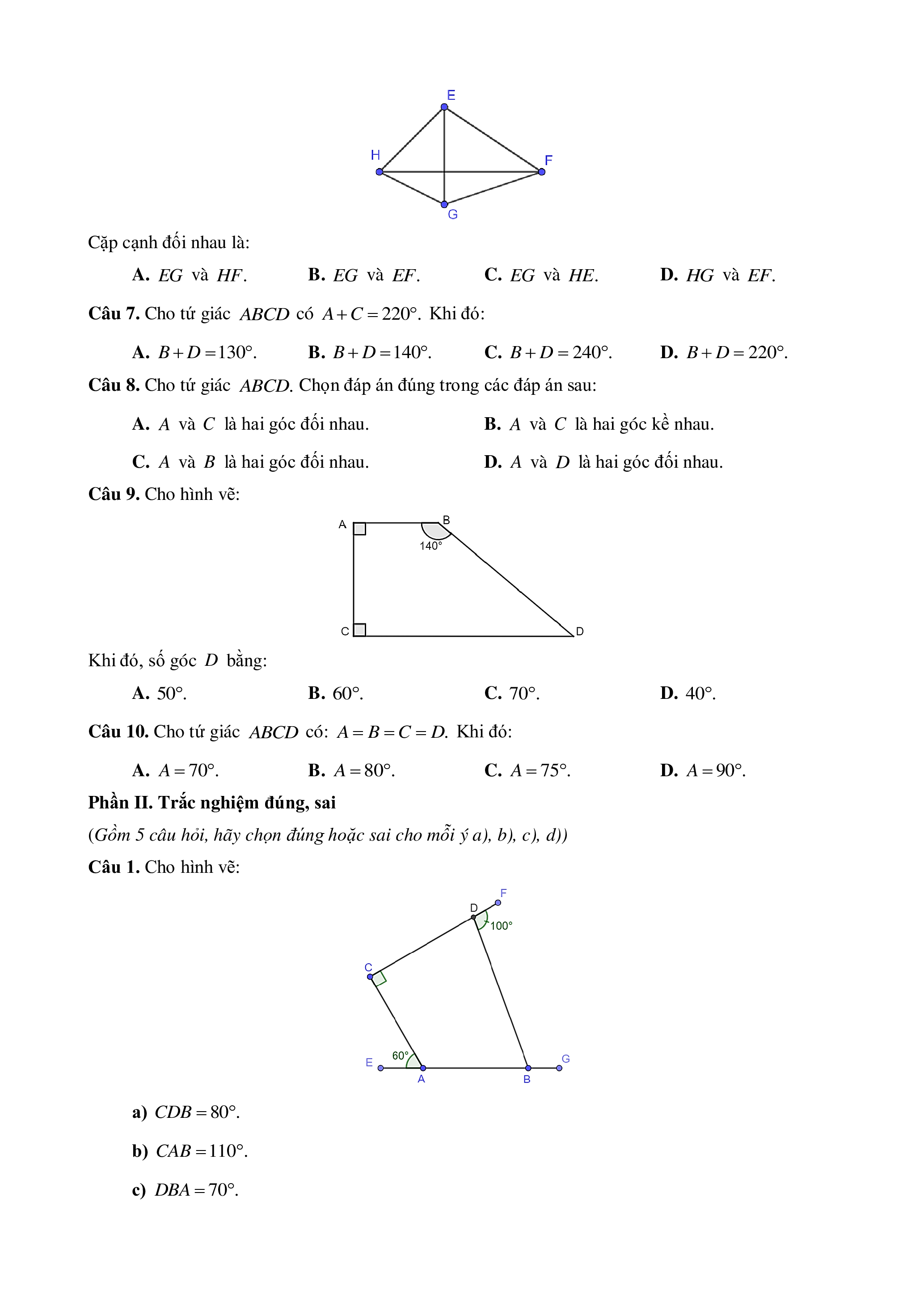 Câu 10. Cho tứ giác ABCD có: A B C . D Khi đó: A. A 70 . B. A 80 . C. A 75 . D. A 90 .