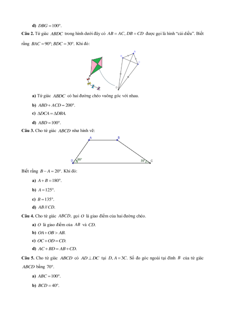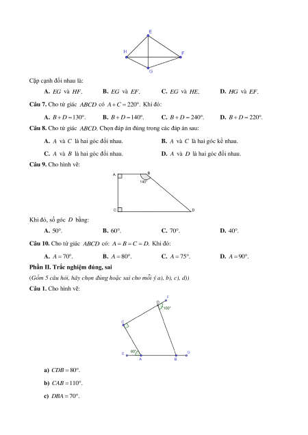 Câu 5. Cho tứ giác ABCD có: A 80 ; B 120 ; D 110 . Khi đó: A. C 50 . B. C 60 . C. C 70 . D. C 40 .