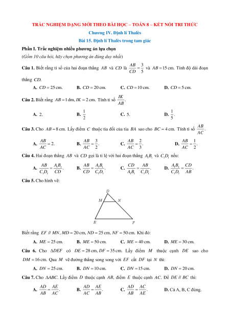 TRẮC NGHIỆM DẠNG MỚI THEO BÀI HỌC – TOÁN 8 – KẾT NỐI TRI THỨC