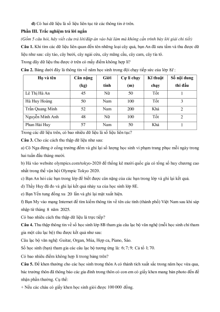 Câu 2. Bảng dưới đây là thông tin về năm học sinh trong đội chạy tiếp sức của lớp 8I : Họ và tên Cân nặng Giới Cự li chạy Kĩ thuật Số nội dung (kg) tính (m) chạy thi đấu Lê Thị Hà An 45 Nữ 50 Tốt 1 Hà Huy Hoàng 50 Nam 100 Tốt 3 Trần Quang Minh 52 Nam 200 Khá 2 Nguyễn Minh Anh 48 Nữ 100 Tốt 2 Phan Hải Huy 57 Nam 50 Khá 1