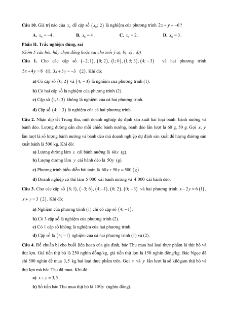 Câu 10. Giá trị nào của x để cặp số x ; 2 là nghiệm của phương trình 2x y 6 ? 0 0 A. x 4 . B. x 4 . C. x 2 . D. x 3. 0 0 0 0