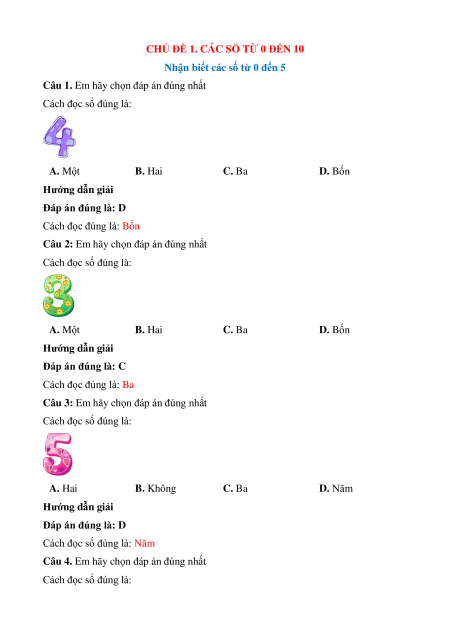 Câu 5. Em hãy chọn đáp án đúng nhất Cách đọc số đúng là: A. Không B. Hai C. Một D. Bốn Hướng dẫn giải