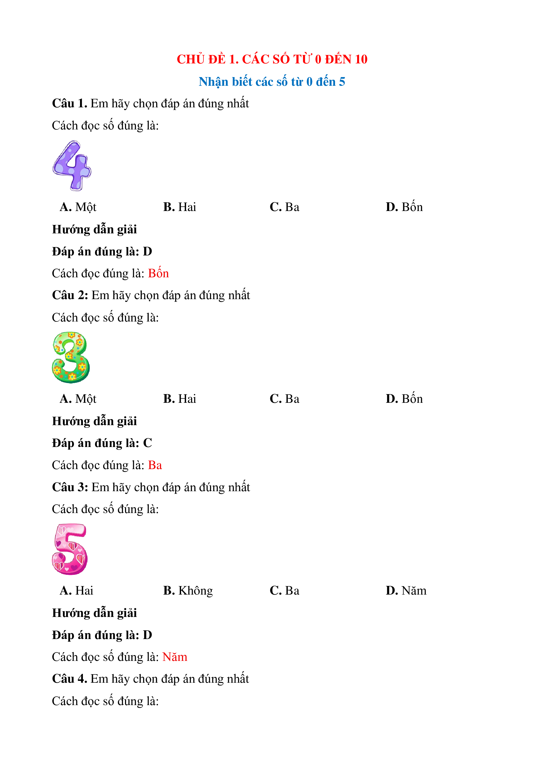 Câu 1. Em hãy chọn đáp án đúng nhất Cách đọc số đúng là: A. Một B. Hai C. Ba D. Bốn Hướng dẫn giải