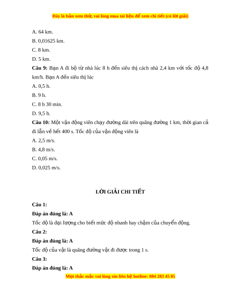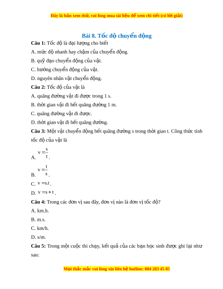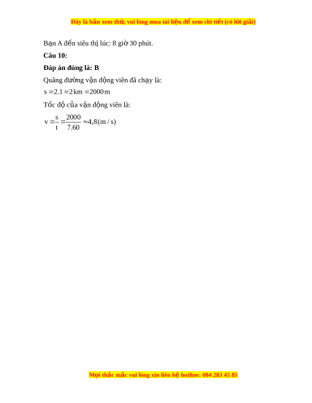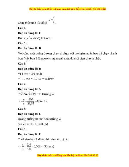 Đây là bản xem th , vu ử i lòng mua tài li u ệ đ xe ể m chi ti t (c ế ó l i ờ gi i ả ) s v Công th c t ứ ính tốc đ l ộ à t . Câu 4: Đáp án đúng là: C Đ n v ơ ị c a t ủ ốc đ l ộ à km/h. Câu 5: Đáp án đúng là: B V i ớ cùng m t ộ quãng đư ng ờ ch y ạ , ai ch y ạ v i ớ th i ờ gian ng n ắ h n ơ thì ch y ạ nhanh h n. ơ V y b ậ n ạ B là ngư i ờ ch y nhanh nh ạ t ấ do th i ờ gian ch y ạ ít nh t ấ . Câu 6: Đáp án đúng là: B Vì 1 m/s = 3,6 km/h 10 m/s = 10. 3,6 = 36 km/h Câu 7: Đáp án đúng là: A Tốc đ c ộ a ủ Vũ Th H ị ư ng ơ là: s 200 v 8 ,5m / s t 23,55 Câu 8: Đáp án đúng là: C Quãng đư ng t ờ ừ nhà đ n t ế rư ng ờ là: S = v. t = 16 . 0,5 = 8 (m) Câu 9: Đáp án đúng là: C Th i ờ gian b n ạ A đi t nhà đ ừ n s ế iêu th l ị à: s 2,4 t 0 ,5(h) 3 0(min) t 4,8 M i