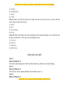 ế siêu thị cách nhà 2,4 km v i ớ t c ố độ 4,8 km/h. B n ạ A đ n s ế iêu th l ị úc A. 0,5 h. B. 9 h. C. 8 h 30 min. D. 9,5 h. Câu 10: M t ộ v n ậ đ ng ộ viên ch y ạ đư ng ờ dài trên quãng đư ng ờ 1 km, th i ờ gian cả đi lẫn về h t ế 400 s. Tốc đ c ộ a ủ v n đ ậ ng vi ộ ên là A. 2,5 m/s. B. 4,8 m/s. C. 0,05 m/s. D. 0,025 m/s. LỜI GIẢI CHI TI T Ế Câu 1: Đáp án đúng là: A Tốc đ l ộ à đ i ạ lư ng cho bi ợ t ế m c ứ đ nhanh hay ch ộ m ậ c a chuy ủ n ể đ ng. ộ Câu 2: Đáp án đúng là: A Tốc đ c ộ a ủ v t ậ là quãng đư ng v ờ t ậ đi đư c ợ trong 1 s. Câu 3: Đáp án đúng là: A M i