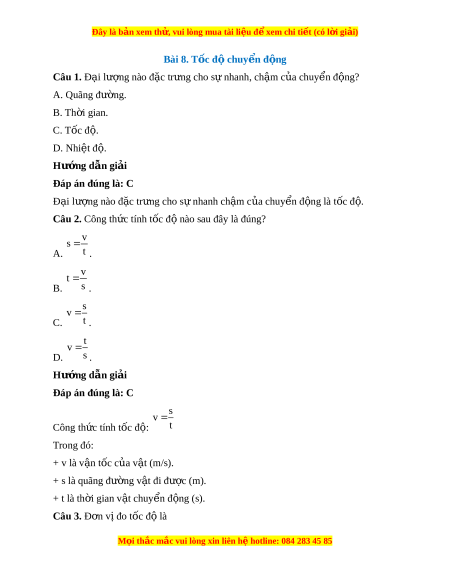 Đây là bản xem th , vu ử i lòng mua tài li u ệ đ xe ể m chi ti t (c ế ó l i ờ gi i ả ) Bài 8. Tốc đ chuy ộ n đ ể ng ộ Câu 1. Đ i ạ lư ng nào đ ợ c ặ tr ng ư cho s nhanh, ự ch m ậ c a ủ chuy n đ ể ng? ộ A. Quãng đư ng. ờ B. Th i ờ gian. C. Tốc đ . ộ D. Nhi t ệ đ . ộ Hư ng d ớ ẫn gi i ả Đáp án đúng là: C Đ i ạ lư ng nào đ ợ c ặ tr ng ư cho s nhanh ự ch m ậ c a ủ chuy n đ ể ng l ộ à t c đ ố . ộ Câu 2. Công th c t ứ ính t c ố đ nào s ộ au đây là đúng? v s A. t . v t B. s . s v C. t . t v D. s . Hư ng d ớ ẫn gi i ả Đáp án đúng là: C s v Công th c t ứ ính t c ố đ : ộ t Trong đó: + v là v n ậ tốc c a v ủ t ậ (m/s). + s là quãng đư ng v ờ t ậ đi đư c ( ợ m). + t là th i ờ gian v t ậ chuy n đ ể ng ( ộ s). Câu 3. Đ n ơ v đo t ị ốc đ l ộ à M i