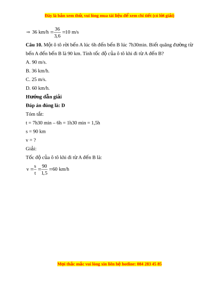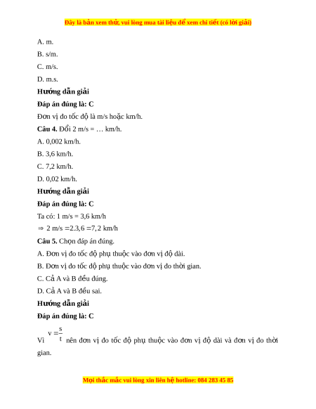 Đây là bản xem th , vu ử i lòng mua tài li u ệ đ xe ể m chi ti t (c ế ó l i ờ gi i ả ) A. m. B. s/m. C. m/s. D. m.s. Hư ng d ớ ẫn gi i ả Đáp án đúng là: C Đ n ơ v đo t ị ốc đ l ộ à m/s ho c km ặ /h.