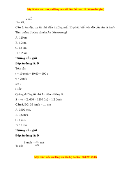 Đây là bản xem th , vu ử i lòng mua tài li u ệ đ xe ể m chi ti t (c ế ó l i ờ gi i ả ) s v D – sai, t Câu 8. An đ p ạ xe từ nhà đ n ế trư ng ờ m t ấ 10 phút, bi t ế t c ố độ c a ủ An là 2m/s. Tính quãng đư ng t ờ nhà ừ An đ n t ế rư ng? ờ A. 120 m. B. 1,2 m. C. 12 km. D. 1,2 km. Hư ng d ớ ẫn gi i ả Đáp án đúng là: D Tóm t t ắ : t = 10 phút = 10.60 = 600 s v = 2 m/s s = ? Gi i ả : Quãng đư ng t ờ nhà ừ An đ n t ế rư ng ờ là: