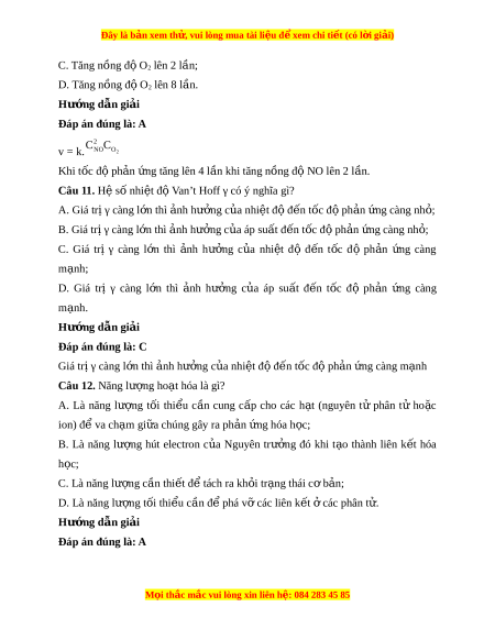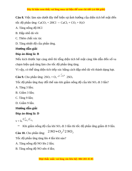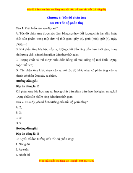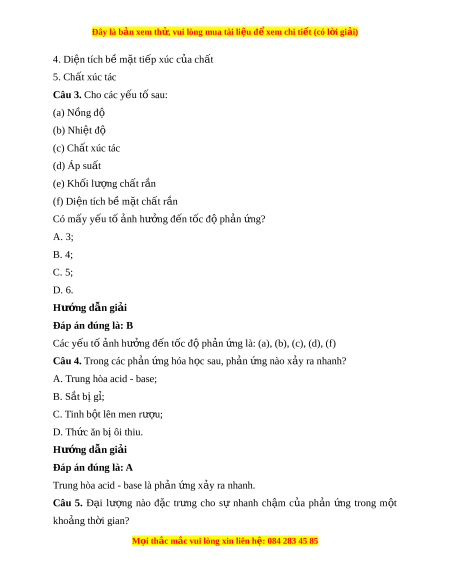 Đây là bản xem th , vu ử i lòng mua tài li u ệ đ xe ể m chi ti t (c ế ó l i ờ gi i ả ) 4. Di n t ệ ích b m ề t ặ ti p ế xúc c a ch ủ t ấ 5. Chất xúc tác Câu 3. Cho các y u t ế ố sau: (a) Nồng độ (b) Nhi t ệ độ (c) Ch t ấ xúc tác (d) Áp su t ấ (e) Khối lư ng ợ ch t ấ r n ắ (f) Di n t ệ ích b m ề t ặ ch t ấ r n ắ Có mấy y u ế tố nh ả hư ng đ ở n t ế c đ ố ph ộ n ả ng? ứ A. 3; B. 4; C. 5; D. 6. Hư ng d ớ ẫn gi i ả Đáp án đúng là: B Các y u t ế ố nh h ả ư ng ở đ n t ế c ố đ ph ộ n ả ng