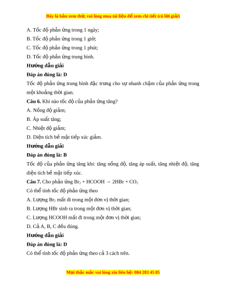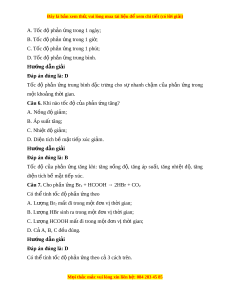 Câu 6. Khi nào tốc đ c ộ a ủ ph n ả ng ứ tăng? A. Nồng đ gi ộ m ả ; B. Áp su t ấ tăng; C. Nhi t ệ độ gi m ả ; D. Di n t ệ ích b m ề t ặ ti p xúc gi ế m ả . Hư ng d ớ ẫn gi i ả Đáp án đúng là: B Tốc độ c a ủ ph n ả ng ứ tăng khi: tăng n ng ồ đ , ộ tăng áp su t ấ , tăng nhi t ệ đ , ộ tăng diện tích b m ề t ặ ti p ế xúc. Câu 7. Cho ph n ả ng B ứ r2 + HCOOH → 2HBr + CO2 Có th t ể ính t c đ ố ộ ph n ả ng t ứ heo A. Lư ng B ợ r2 mất đi trong m t ộ đ n v ơ t ị h i ờ gian; B. Lư ng ợ HBr sinh ra trong m t ộ đ n ơ v t ị h i ờ gian; C. Lư ng ợ HCOOH m t ấ đi trong m t ộ đ n ơ v t ị h i ờ gian; D. C ả A, B, C đ u ề đúng. Hư ng d ớ ẫn gi i ả Đáp án đúng là: D Có th t ể ính t c đ ố ộ ph n ả ng t ứ heo c 3 cách ả trên. M i