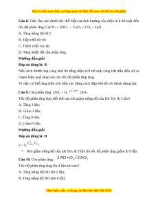 CaCO3 + 2HCl → CaCl2 + CO2 + H2O A. Tăng nồng đ H ộ Cl B. Đ p nh ậ ỏ đá vôi C. Thêm ch t ấ xúc tác D. Tăng nhi t ệ đ c ộ a ủ ph n ả ng. ứ Hư ng d ớ ẫn gi i ả Đáp án đúng là: B N u ế kích thư c ớ h t ạ càng nhỏ thì t ng ổ di n ệ tích b ề m t ặ càng l n ớ d n ẫ đ n ế s ố va ch m ạ hiệu qu t ả ăng làm cho tốc đ ph ộ n ả ng t ứ ăng. Vì v y ậ , có th t ể ăng di n t ệ ích ti p xúc b ế ng cách ằ đ p nh ậ đá vôi ỏ thành d ng h ạ t ạ . t Câu 9. Cho ph n ả ng: ứ 2SO 2 + O2 2SO3 Tốc đ ph ộ n ả ng ứ thay đổi th nào khi ế gi m ả n ng đ ồ ộ c a khí ủ SO2 đi 3 lần? A. Tăng 3 lần; B. Gi m ả 3 l n; ầ C. Tăng 9 l n ầ ; D. Gi m ả 9 l n. ầ Hư ng d ớ ẫn gi i ả Đáp án đúng là: D 2 C .C v = k. SO2 O2 ⇒ Khi gi m ả nồng đ c ộ a
