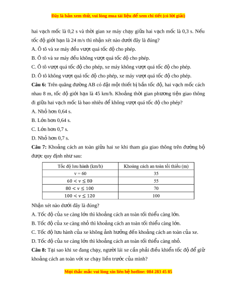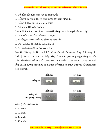 Đây là bản xem th , vu ử i lòng mua tài li u ệ đ xe ể m chi ti t (c ế ó l i ờ gi i ả ) A. Đ đ ể m ả b o t ả ầm nhìn v i ớ xe phía trước. B. Đ t ể ránh va ch m ạ khi xe phía trư c đ ớ t ộ ng t ộ d ng ừ l i ạ . C. Đ t ể ránh khói b i ụ c a ủ xe phía trư c. ớ D. Đ gi ể m ả thi u t ể ắc đư ng. ờ Câu 9: Khi m t ộ ngư i ờ lái xe nhanh s