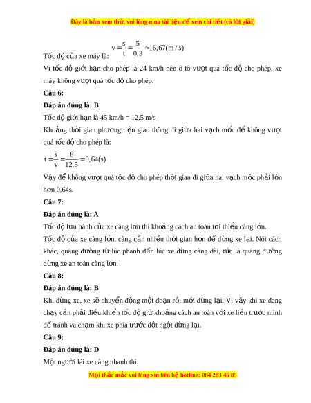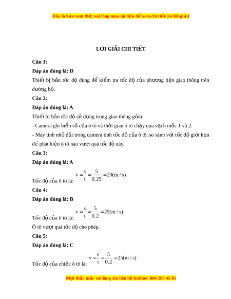 Đây là bản xem th , vu ử i lòng mua tài li u ệ đ xe ể m chi ti t (c ế ó l i ờ gi i ả ) LỜI GIẢI CHI TI T Ế Câu 1: Đáp án đúng là: D Thi t ế bị b n ắ t c ố độ dùng để ki m ể tra t c ố độ c a ủ phư ng ơ ti n ệ giao thông trên đư ng b ờ . ộ Câu 2: Đáp án đúng là: A Thi t ế bị b n ắ tốc độ s d ử ng t ụ rong giao thông g m ồ : - Camera ghi bi n s ể ố c a ô t ủ ô và th i ờ gian ô tô ch y qua v ạ ch m ạ c 1 và 2. ố - Máy tính nh ỏ đ t ặ trong camera tính t c ố đ ộ c a ủ ô tô, so sánh v i ớ t c ố đ ộ gi i ớ h n ạ đ phát ể hi n ô t ệ ô nào vư t ợ quá tốc đ này ộ . Câu 3: Đáp án đúng là: A s 5 v 20 (m / s) Tốc đ c ộ a ủ ô tô là: t 0,25 Câu 4: Đáp án đúng là: B s 5 v 25 (m / s) Tốc đ c ộ a ủ ô tô là: t 0,2 Ô tô vư t ợ quá tốc đ cho phép. ộ Câu 5: Đáp án đúng là: C s 5 v 25 (m / s) Tốc đ c ộ a ủ chi c ô t ế ô là: t 0,2 M i