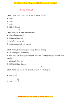 Câu 1. Cho a, b , b ≠ 0, x = b . N u ế a, b khác dâu thi: A. x = 0; B. x > 0; C. x < 0; D. C B a , C đ u s ê ai. 3 Câu 2. Số h u t ữ ỉ 4 đư c ợ bi u di ể n b ễ i ở : A. Bốn đi m ể trên tr c s ụ ố; B. Ba đi m ể trên tr c ụ s ; ố C. Hai đi m ể trên tr c s ụ ; ố D. M t ộ đi m ể duy nh t â trên tr c s ụ . ố Câu 3. Kh ng ẳ đ nh nào t ị rong các kh ng đ ẳ nh s ị au là đúng? A. Số 0 không ph i a là số h u t ữ ỉ; B. Số 0 là số h u ữ tỉ nh ng ư không ph i a là số h u ữ tỉ dư ng ơ cũng không ph i a là số h u t ữ ỉ âm; C. Số 0 là số h u ữ t âm ỉ ; D. Số 0 là số h u t ữ ỉ dư ng. ơ 7 Câu 4. Số đối c a ủ các số h u t
