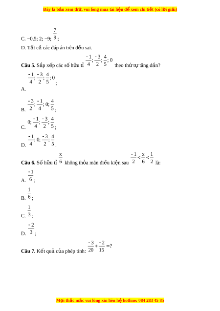 D. Tât ca các đáp án trên đ u s ê ai. 1 3 4 ; ; ; 0 Câu 5. S p ắ x p các s ế ố h u ữ t ỉ 4 2 5 theo th t ứ ự tăng dần? 1 3 4 ; ; ; 0 4 2 5 ; A. 3 1 4 ; ; 0; B. 2 4 5 ; 1 3 4 0; ; ; C. 4 2 5 ; 1 3 4 ; 0; ; D. 4 2 5 . x 1 x 1 Câu 6. Số h u t ữ ỉ 6 không th a m ỏ ãn đi u ki ê n s ệ au 2 6 2 là: 1 A. 6 ; 1 B. 6 ; 1 C. 3 ; 2 D. 3 ; 3 2 ? Câu 7. K t ế qua c a phép ủ tính: 20 15 M i ọ thắc m c