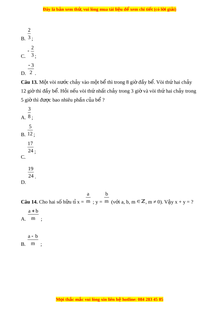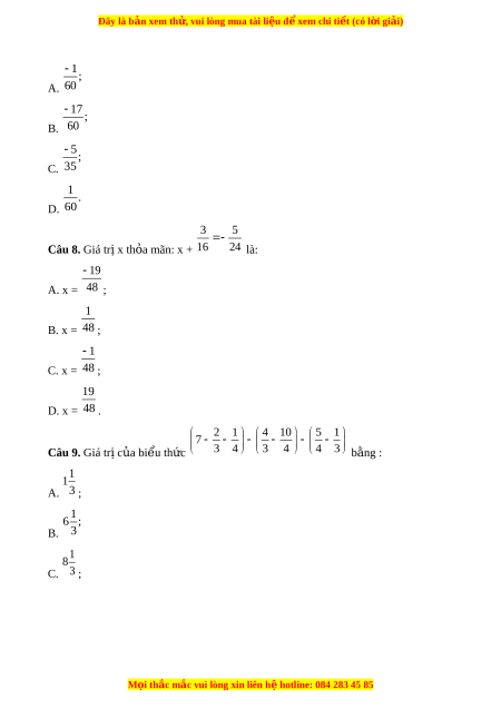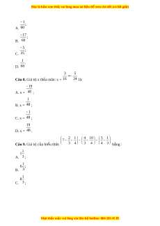 Đây là bản xem th , vu ử i lòng mua tài li u ệ đ xe ể m chi ti t ế (có l i ờ gi i ả ) 1; A. 60 17 ; B. 60 5 ; C. 35 1 . D. 60 3 5 Câu 8. Giá tr x t ị h a m ỏ ãn: x + 16 24 là: 19 A. x = 48 ; 1 B. x = 48 ; 1 C. x = 48 ; 19 D. x = 48 . 2 1 4 10 5 1 7 Câu 9. Giá tr c ị a bi ủ u t ể h c ứ 3 4 3 4 4 3 b ng ằ : 1 1 A. 3 ; 1 6 ; B. 3 1 8 C. 3 ; M i ọ thắc m c