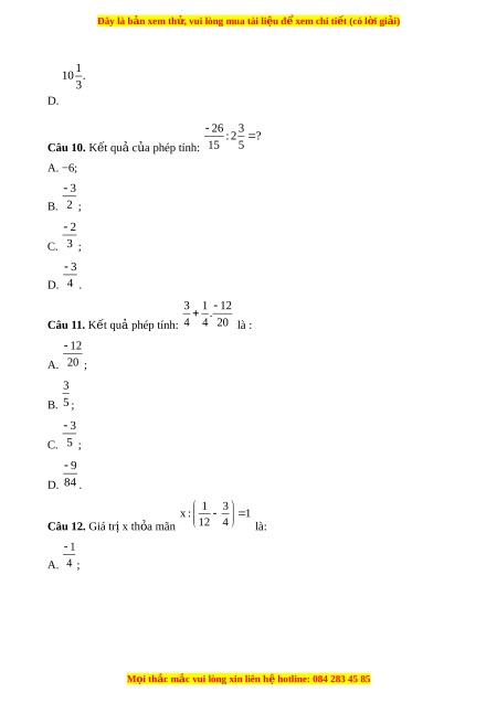 Đây là bản xem th , vu ử i lòng mua tài li u ệ đ xe ể m chi ti t ế (có l i ờ gi i ả ) 1 10 . 3 D. 26 3 : 2 ? Câu 10. K t ế qua c a phép ủ tính: 15 5 A. −6; 3 B. 2 ; 2 C. 3 ; 3 D. 4 . 3 1 12 . Câu 11. K t