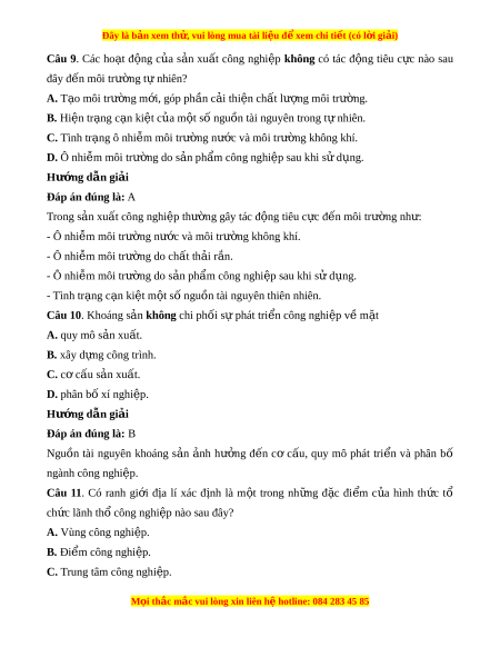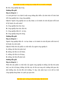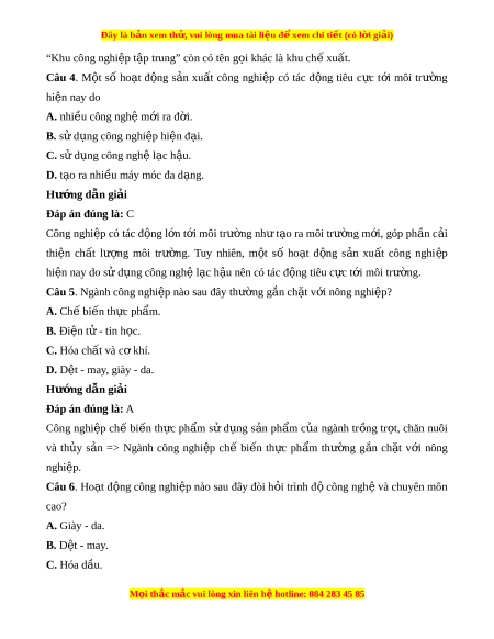 Đây là bản xem th , vu ử i lòng mua tài li u ệ đ xe ể m chi ti t (c ế ó l i ờ gi i ả ) “Khu công nghi p t ệ p ậ trung” còn có tên g i ọ khác là khu ch xu ế t ấ . Câu 4. M t ộ số ho t ạ đ ng ộ s n ả xu t ấ công nghi p ệ có tác đ ng ộ tiêu c c ự t i ớ môi trư ng ờ hiện nay do A. nhi u công ề nghệ m i ớ ra đ i ờ . B. s d ử ng ụ công nghiệp hiện đ i ạ . C. sử d ng công ngh ụ ệ l c ạ h u. ậ D. t o ạ ra nhi u ề máy móc đa d ng. ạ Hư ng d ớ ẫn gi i ả Đáp án đúng là: C Công nghi p có ệ tác đ ng ộ l n t ớ i ớ môi trư ng ờ nh t ư o ạ ra môi trư ng ờ m i ớ , góp ph n ầ c i ả thi n ệ ch t ấ lư ng ợ môi trư ng. ờ Tuy nhiên, m t ộ số ho t ạ đ ng ộ s n ả xu t ấ công nghi p ệ