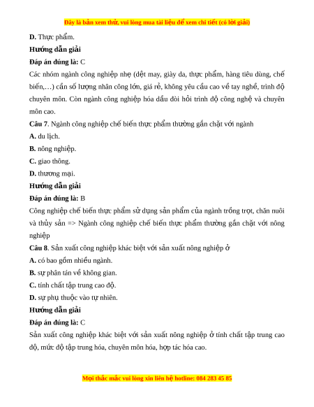 Câu 7. Ngành công nghi p ch ệ ế bi n t ế h c ph ự m ẩ thư ng g ờ n ắ ch t ặ v i ớ ngành A. du lịch. B. nông nghiệp. C. giao thông. D. thư ng ơ m i ạ . Hư ng d ớ ẫn gi i ả Đáp án đúng là: B Công nghi p ệ chế bi n ế th c ự ph m ẩ s ử d ng ụ s n ả ph m ẩ c a ủ ngành tr ng ồ tr t ọ , chăn nuôi và th y ủ s n ả => Ngành công nghi p ệ chế bi n ế th c ự ph m ẩ thư ng ờ g n ắ ch t ặ v i ớ nông nghiệp Câu 8. S n ả xu t ấ công nghi p khác ệ bi t ệ v i ớ s n xu ả t ấ nông nghi p ệ ở