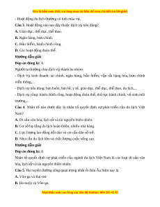 D. Tài chính ngân hàng là m t ộ lĩnh v c ự r t ấ r ng và nhi ộ u ho ề t ạ đ ng. ộ Hư ng d ớ ẫn gi i ả Đáp án đúng là: B Ngành du lịch có m t ộ số đ c đi ặ m ể nổi b t ậ sau: - Ho t ạ đ ng ộ du l ch ị thư ng ờ g n ắ v i ớ tài nguyên du l ch, ị khách du l ch ị ph i ả đ n ế n i ơ có