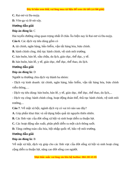 D. Vôn-ga và Iê-nít-xây. Hư ng d ớ ẫn gi i ả Đáp án đúng là: C Hai tuy n ế đư ng s ờ ông quan tr ng nh ọ t ấ châu ở Âu hi n nay ệ là Rai-n và Đ ơ a-nuýp. Câu 6. Các d ch v ị t ụ iêu dùng g m ồ có