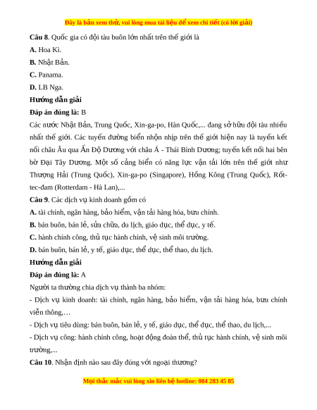 Câu 8. Quốc gia có đ i ộ tàu buôn l n nh ớ t ấ trên th gi ế i ớ là A. Hoa Kì. B. Nh t ậ B n. ả C. Panama. D. LB Nga. Hư ng d ớ ẫn gi i ả Đáp án đúng là: B Các nư c ớ Nh t ậ B n, ả Trung Qu c, ố Xin-ga-po, Hàn Qu c,... ố đang s ở h u ữ đ i ộ tàu nhi u ề nhất thế gi i ớ . Các tuy n ế đư ng ờ bi n ể nh n ộ nh p ị trên thế gi i ớ hi n ệ nay là tuy n ế k t ế nối châu Âu qua n Ấ Độ Dư ng ơ v i