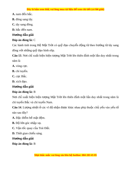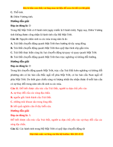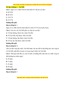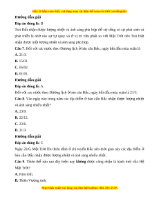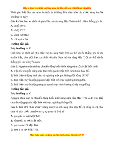Câu 5. Nguyên nhân sinh ra chuy n đ ể ng bi ộ u ể ki n ế hàng năm c a M ủ t ặ Tr i ờ là do A. V n ậ tốc chuy n đ ể ng c ộ a ủ Trái Đ t ấ quanh M t ặ Tr i ờ luôn luôn thay đ i ổ . B. Trái Đ t ấ có d ng hì ạ nh c u và nghi ầ êng m t ộ góc không đ i ổ b ng ằ 66°33’. C. Trái Đất chuy n ể đ ng quanh M ộ t ặ Tr i ờ v i ớ tr c ụ nghiêng không đ i ổ . D. Trái Đất chuy n ể đ ng t ộ quay quanh t ự r c t ụ heo hư ng ớ t t ừ ây sang đông. Hư ng d ớ ẫn gi i ả Đáp án đúng là: C Nguyên nhân sinh ra chuy n ể đ ng ộ bi u ể ki n ế hàng năm c a ủ M t ặ Tr i ờ là do Trái Đ t ấ chuy n ể đ ng quanh M ộ t ặ Tr i ờ v i ớ tr c ụ nghiêng không đ i ổ . Câu 6. Trái Đ t ấ nh n ậ đư c ợ lư ng ợ nhi t ệ và ánh sáng phù h p ợ để sự s ng ố có sự phát sinh và phát tri n ể là nh vào s ờ ự t quay và ự v ở t ị rí A. quá gần so v i ớ M t ặ Tr i ờ . B. v a ph ừ i ả so v i ớ M t ặ Tr i ờ . C. quá xa so v i ớ M t ặ Tr i ờ . D. h p ợ lí so v i ớ M t ặ Tr i ờ . M i