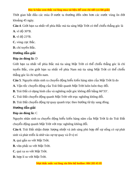 Đây là bản xem th , vu ử i lòng mua tài li u ệ đ xe ể m chi ti t (c ế ó l i ờ gi i ả ) Th i ờ gian b t ắ đ u ầ các mùa ở nư c ớ ta thư ng ờ đ n ế s m ớ h n ơ các nư c ớ vùng ôn đ i ớ kho ng ả 45 ngày. Câu 4. Gi i ớ h n ạ xa nh t ấ v phí ề a B c m ắ à tia sáng M t ặ Tr i ờ có th chi ể u t ể h ng ẳ góc là A. vĩ đ 30°B ộ . B. vĩ đ 23°B ộ . C. vòng c c ự B c. ắ D. chí tuy n B ế c. ắ Hư ng d ớ ẫn gi i ả Đáp án đúng là: D Gi i ớ h n ạ xa nh t ấ về phía B c ắ mà tia sáng M t ặ Tr i ờ có thể chi u ể th ng ẳ góc là chí tuy n ế B c, ắ còn gi i ớ h n ạ xa nh t