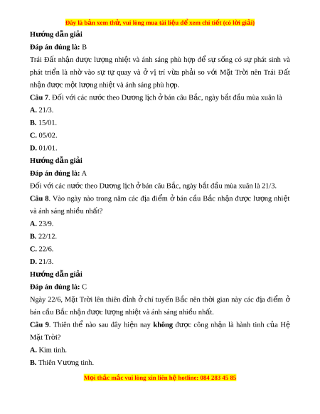 Đây là bản xem th , vu ử i lòng mua tài li u ệ đ xe ể m chi ti t (c ế ó l i ờ gi i ả ) Hư ng d ớ ẫn gi i ả Đáp án đúng là: B Trái Đ t ấ nh n ậ đư c ợ lư ng ợ nhi t ệ và ánh sáng phù h p ợ để sự s ng ố có sự phát sinh và phát tri n