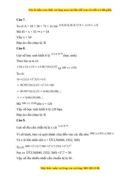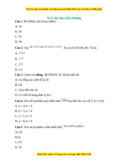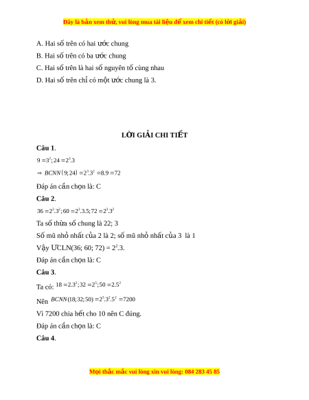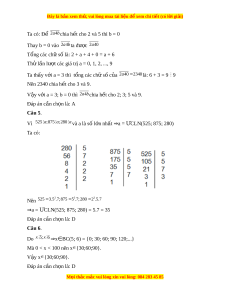 ủ 2 là 2; số mũ nhỏ nh t ấ c a ủ 3 là 1 V y ậ ƯCLN(36; 60; 72) = 22.3. Đáp án c n ch ầ n l ọ à: C Câu 3. 2 5 2 Ta có: 18 2.3 ;32 2 ;50 2.5 5 2 2 Nên BCNN(18;32;50) 2 .3 .5 7200 Vì 7200 chia h t ế cho 10 nên C đúng. Đáp án c n ch ầ n l ọ à: C Câu 4. M i ọ thắc m c