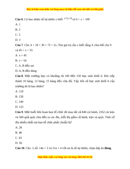thành 10 hàng, 12 hàng, 15 hàng đ u ề v a ừ đ . ủ V y ậ h i ỏ số h c ọ sinh kh i ố 6 c a ủ trư ng đó l ờ à bao nhiêu? A. 110 B. 120 C. 140 D. 125 Câu 9. M t ộ bu i ổ liên hoan ban tổ ch c ứ đã mua t t ấ c
