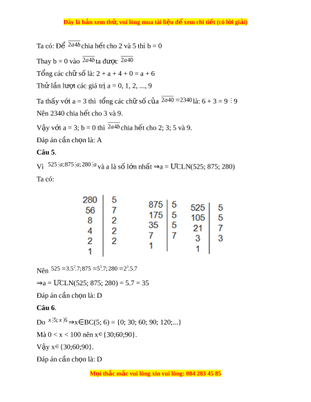 ⇒a = ƯCLN(525; 875; 280) = 5.7 = 35 Đáp án c n ch ầ n l ọ à: D Câu 6. Do x 5 ; x 6