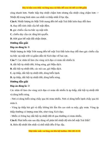 Đây là bản xem th , vu ử i lòng mua tài li u ệ đ xe ể m chi ti t (c ế ó l i ờ gi i ả ) cũng nhanh h n. ơ Nư c ớ h p ấ thụ nhi t ệ ch m ậ h n ơ nh ng ư t a ỏ nhi t ệ cũng ch m ậ h n ơ -> Nhi t ệ đ t ộ rung bình năm cao nh t ấ và th p nh ấ t ấ l ở c đ ụ a. ị Câu 6. Nhi t ệ lư ng do M ợ t ặ Tr i ờ mang đ n b ế ề m t ặ Trái Đ t ấ luôn thay đ i ổ theo