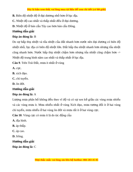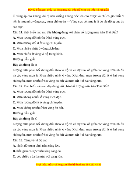 Câu 9. Trên Trái Đ t ấ , m a í ư t nh t ấ vùng ở A. c c. ự B. xích đ o. ạ C. chí tuy n. ế D. ôn đ i ớ . Hư ng d ớ ẫn gi i ả Đáp án đúng là: A Lư ng ợ m a ư phân bố không đ u ề theo vĩ đ ộ và có s ự xen k ẽ gi a ữ các vùng m a ư nhi u ề và các vùng m a ư ít. M a ư nhi u ề nh t ấ ở vùng Xích đ o, ạ m a ư tư ng ơ đ i ố ít ở hai vùng chí tuy n, m ế a ư nhi u ề hai ở vùng ôn đ i ớ và m a ư r t ấ ít hai ở vùng c c. ự Câu 10. Vùng c c có ự m a í ư t là do tác đ ng c ộ a ủ A. địa hình. B. áp thấp. C. áp cao. D. frông. Hư ng d ớ ẫn gi i ả Đáp án đúng là: C M i