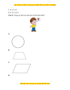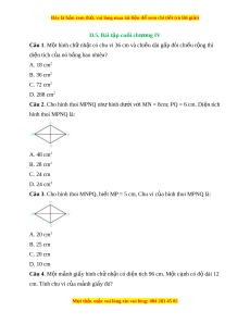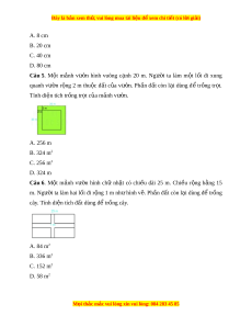 Đây là bản xem th , vu ử i lòng mua tài li u ệ đ xe ể m chi ti t (c ế ó l i ờ gi i ả ) A. 8 cm B. 20 cm C. 40 cm D. 80 cm Câu 5. M t ộ m nh ả vư n ờ hình vuông c nh ạ 20 m. Ngư i ờ ta làm m t ộ l i ố đi xung quanh vư n ờ r ng ộ 2 m thu c ộ đ t ấ c a ủ vư n. ờ Ph n ầ đ t ấ còn l i ạ dùng đ ể tr ng ồ tr t ọ . Tính di n t ệ ích tr ng t ồ r t ọ c a ủ m nh v ả ư n. ờ A. 256 m B. 324 m2 C. 256 m2 D. 324 m Câu 6. M t ộ m nh ả vư n ờ hình chữ nh t ậ có chi u ề dài 25 m. Chi u ề r ng ộ b ng ằ 15 m. Ngư i ờ ta làm hai l i ố đi r ng 1 m ộ nh hì ư nh v . Ph ẽ n đ ầ t ấ còn l i ạ dùng đ t ể r ng ồ cây. Tính di n t ệ ích đ t ấ dùng đ t ể r ng cây ồ . A. 84 m2 B. 336 m2 C. 152 m2 D. 58 m2 M i ọ thắc m c
