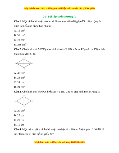 Câu 3. Cho hình thoi MNPQ, bi t ế MP = 5 cm, Chu vi c a ủ hình thoi MPNQ là: A. 20 cm2 B. 25 cm C. 20 cm D. 10 cm Câu 4. M t ộ m nh gi ả ấy hình ch nh ữ t ậ có di n t ệ ích 96 cm. M t ộ c nh có đ ạ dài ộ 12 cm. Tính chu vi c a ủ m nh gi ả y đó? ấ M i ọ thắc m c