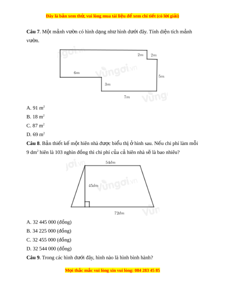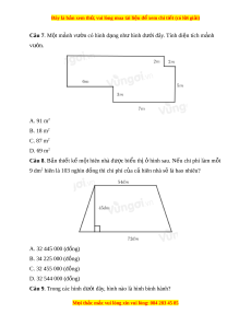 Đây là bản xem th , vu ử i lòng mua tài li u ệ đ xe ể m chi ti t (c ế ó l i ờ gi i ả ) Câu 7. M t ộ m nh v ả ư n ờ có hình d ng nh ạ ư hình dư i ớ đây. Tính di n t ệ ích m nh ả vư n. ờ A. 91 m2 B. 18 m2 C. 87 m2 D. 69 m2 Câu 8. B n t ả hi t ế k m ế t ộ hiên nhà đư c bi ợ u t ể h ị hì ở nh sau. N u chi ế phí làm m i ỗ