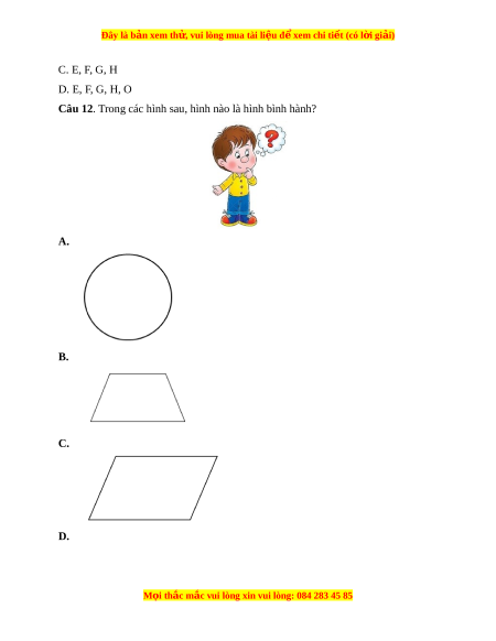 Câu 12. Trong các hình sau, hình nào là hình bình hành?