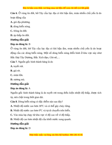 Câu 6. Ở vùng ôn đ i ớ , bờ Tây c a ủ l c ụ đ a ị có khí h u ậ m ấ , m a ư nhi u ề chủ y u ế là do ho t ạ đ ng c ộ a ủ A. gió địa phư ng. ơ B. dòng bi n nóng. ể C. frông ôn đ i ớ . D. áp thấp ôn đ i ớ . Hư ng d ớ ẫn gi i ả Đáp án đúng là: B Ở vùng ôn đ i ớ , bờ Tây c a ủ l c ụ đ a ị có khí h u ậ m ấ , m a ư nhi u ề chủ y u ế là do ho t ạ đ ng ộ c a ủ các dòng bi n ể nóng. M t ộ số dòng bi n ể nóng đi n ể hình ở khu v c ự này như B c Đ ắ i ạ Tây Dư ng, ơ B c ắ Xích đ o, G ạ hi-nê,…