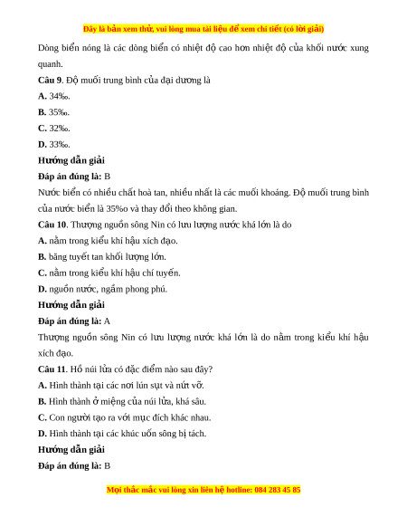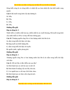Câu 9. Độ muối trung bình c a đ ủ i ạ dư ng ơ là A. 34‰. B. 35‰. C. 32‰. D. 33‰. Hư ng d ớ ẫn gi i ả Đáp án đúng là: B Nư c ớ bi n ể có nhi u ề ch t ấ hoà tan, nhi u ề nh t ấ là các mu i ố khoáng. Đ ộ mu i ố trung bình c a ủ nư c bi ớ n l ể à 35%o và thay đ i ổ theo không gian. Câu 10. Thư ng