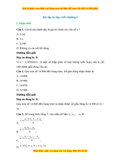 ử vui lòng mua tài li u ệ đ ể xem chi ti t ế (có l i ờ gi i ả ) Bài t p ôn t ậ p cu ậ i ố chư ng ơ 6 I. Nhận bi t ế Câu 1. Giá tr nào d ị ư i ớ đây là giá tr chí ị nh xác c a s ủ π ố ? A. 3,14; B. 3,1; C. 3,146; D. Không có câu tr l ả i ờ đúng. Hư ng ớ d n gi ẫ i ả Đáp án đúng là: D Vì π = 3,14592653... là m t ộ số th p ậ phân vô h n ạ không tu n ầ hoàn, nên ta chỉ vi t ế đư c g ợ ần đúng c a ủ nó.
