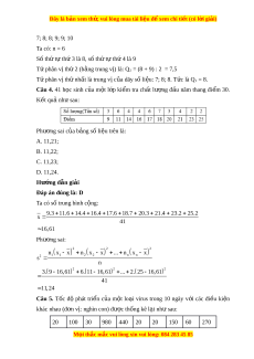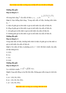 ử vui lòng mua tài li u ệ đ ể xem chi ti t ế (có l i ờ gi i) ả Hư ng d ớ ẫn gi i ả : Đáp án đúng là: A x x ... x 1 2 n x Số trung bình c ng ộ x c a ủ mẫu số liệu x n 1, x2, …,xn là: . Câu 4. Ch n ọ kh ng ẳ đ nh ị đúng: “Trong m t ộ m u ẫ số li u, ệ kho ng ả bi n ế thiên là…” A. hiệu số gi a ữ giá tr l ị n nh ớ t ấ và giá tr nh ị nh ỏ t ấ c a ủ m u s ẫ l ố i u đó; ệ B. tổng số gi a ữ giá tr l ị n nh ớ t ấ và giá tr nh ị ỏ nh t ấ c a ủ m u s ẫ ố li u đó; ệ C. tích gi a gi ữ á tr l ị n nh ớ t ấ và giá tr nh ị nh ỏ t ấ c a m ủ u s ẫ l ố i u đó ệ ; D. thư ng ơ gi a gi ữ á tr l ị n nh ớ t ấ và giá tr nh ị nh ỏ t ấ c a m ủ u s ẫ l ố i u đó. ệ Hư ng d ớ ẫn gi i ả Đáp án đúng là: A Trong m t ộ m u ẫ số li u, ệ kho ng ả bi n ế thiên là hi u ệ số gi a ữ giá tr ịl n ớ nh t ấ và giá trị nh nh ỏ ất c a m ủ ẫu số li u đó. ệ Câu 5. Cho m u ẫ số li u ệ có phư ng