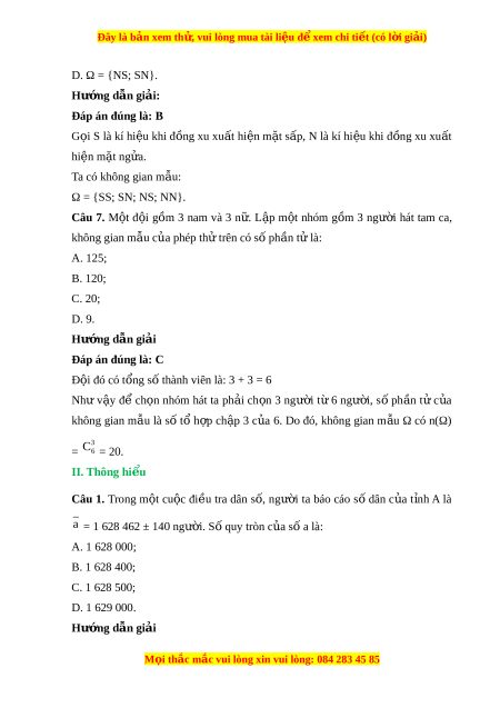ử vui lòng mua tài li u ệ đ ể xem chi ti t ế (có l i ờ gi i ả ) D. Ω = {NS; SN}. Hư ng ớ d n gi ẫ i ả : Đáp án đúng là: B G i ọ S là kí hi u ệ khi đ ng ồ xu xu t ấ hi n ệ m t ặ s p, ấ N là kí hi u ệ khi đ ng ồ xu xu t ấ hiện m t ặ ng a. ử Ta có không gian mẫu: Ω = {SS; SN; NS; NN}. Câu 7. M t ộ đ i ộ g m ồ 3 nam và 3 n . ữ L p ậ m t ộ nhóm g m ồ 3 ngư i ờ hát tam ca, không gian mẫu c a phép t ủ h t ử rên có số phần t l ử à: A. 125; B. 120; C. 20; D. 9. Hư ng ớ d n gi ẫ i ả Đáp án đúng là: C Đ i