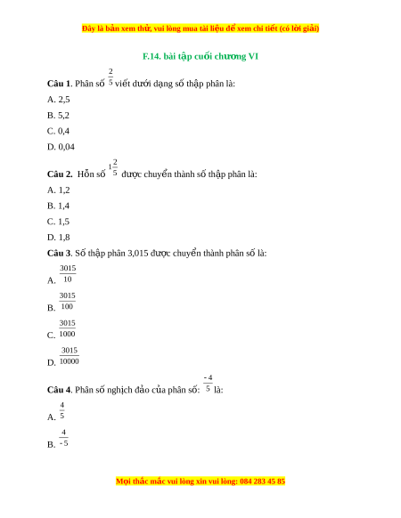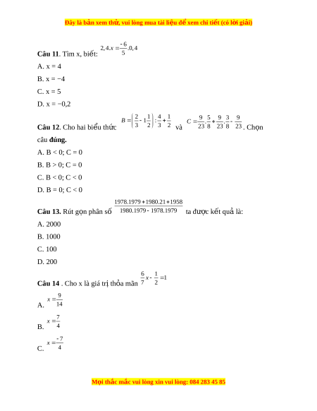 Đây là bản xem th , vu ử i lòng mua tài li u ệ đ xe ể m chi ti t (c ế ó l i ờ gi i ả ) 6 2, 4.x .0, 4 Câu 11. Tìm x, bi t ế : 5 A. x = 4 B. x = −4 C. x = 5 D. x = −0,2 2 1 4 1 B 9 5 9 3 9 1 : C . . Câu 12. Cho hai bi u t ể h c ứ 3 2 3 2 và 23 8 23 8 23 . Ch n ọ câu đúng. A. B < 0; C = 0 B. B > 0; C = 0 C. B < 0; C < 0 D. B = 0; C < 0 1978.1979 1980.211958