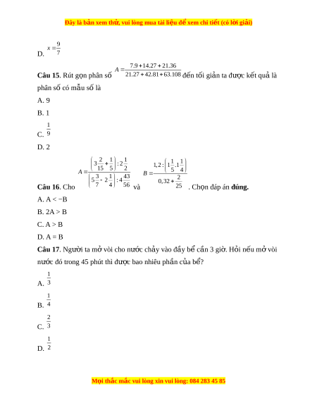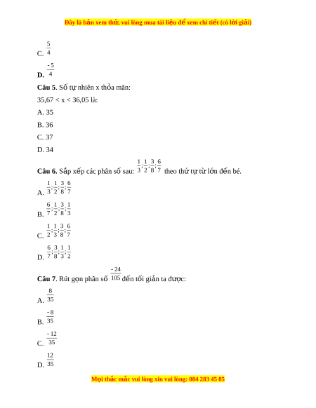 Đây là bản xem th , vu ử i lòng mua tài li u ệ đ xe ể m chi ti t (c ế ó l i ờ gi i ả ) 5 C. 4 5 D. 4 Câu 5. Số t nhi ự ên x th a m ỏ ãn: 35,67 < x < 36,05 là: A. 35 B. 36 C. 37 D. 34 1 1 3 6 ; ; ; Câu 6. S p ắ x p các phân s ế ố sau: 3 2 8 7 theo th t ứ ự t l ừ n đ ớ n bé. ế 1 1 3 6 ; ; ; A. 3 2 8 7 6 1 3 1 ; ; ; B. 7 2 8 3 1 1 3 6 ; ; ; C. 2 3 8 7 6 3 1 1 ; ; ; D. 7 8 3 2 24