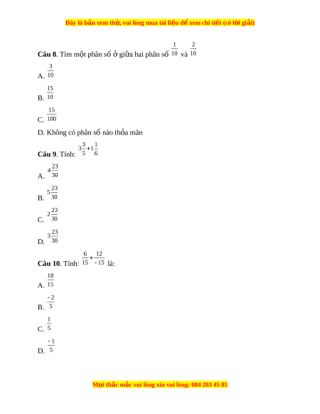 Đây là bản xem th , vu ử i lòng mua tài li u ệ đ xe ể m chi ti t (c ế ó l i ờ gi i ả ) 1 2 Câu 8. Tìm m t ộ phân số gi ở a hai ữ phân số 10 và 10 3 A. 10 15 B. 10 15 C. 100