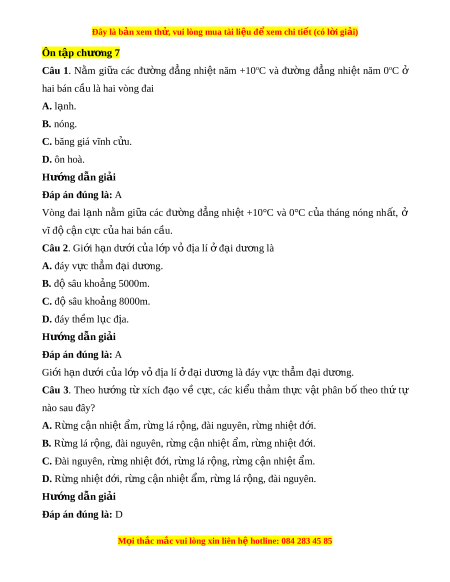 Đây là bản xem th , vu ử i lòng mua tài li u ệ đ xe ể m chi ti t (c ế ó l i ờ gi i ả ) Ôn t p ch ậ ư ng 7 ơ Câu 1. N m ằ gi a ữ các đư ng ờ đ ng ẳ nhi t ệ năm +10oC và đư ng ờ đ ng ẳ nhi t ệ năm 0oC ở hai bán c u l ầ à hai vòng đai A. l nh. ạ B. nóng.