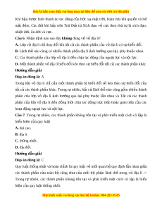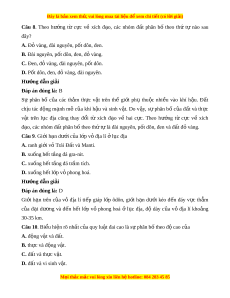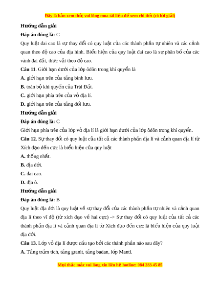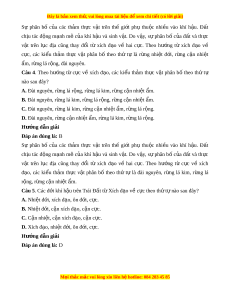C. băng giá vĩnh c u. ử D. ôn hoà. Hư ng d ớ ẫn gi i ả Đáp án đúng là: A Vòng đai l nh ạ n m ằ gi a ữ các đư ng ờ đ ng ẳ nhi t ệ +10°C và 0°C c a ủ tháng nóng nh t ấ , ở vĩ đ c ộ n c ậ c ự c a hai ủ bán c u. ầ Câu 2. Gi i ớ h n ạ dư i ớ c a ủ l p v ớ đ ỏ a l ị í đ ở i ạ dư ng l ơ à A. đáy v c ự th m ẳ đ i ạ dư ng. ơ B. đ s ộ âu kho ng 5000m ả . C. độ sâu kho ng ả 8000m. D. đáy th m ề l c ụ đ a. ị Hư ng d ớ ẫn gi i ả Đáp án đúng là: A Gi i ớ h n ạ dư i ớ c a ủ l p v ớ đ ỏ a l ị í đ ở i ạ dư ng l ơ à đáy v c ự th m ẳ đ i ạ dư ng. ơ Câu 3. Theo hư ng ớ từ xích đ o ạ về c c, ự các ki u ể th m ả th c ự v t ậ phân bố theo th ứ tự nào sau đây? A. R ng ừ c n ậ nhi t ệ m ẩ , r ng l ừ á r ng, đài ộ nguyên, r ng nh ừ i t ệ đ i ớ . B. R ng l ừ á r ng, đài ộ nguyên, r ng c ừ n ậ nhi t ệ m ẩ , r ng nhi ừ t ệ đ i ớ .